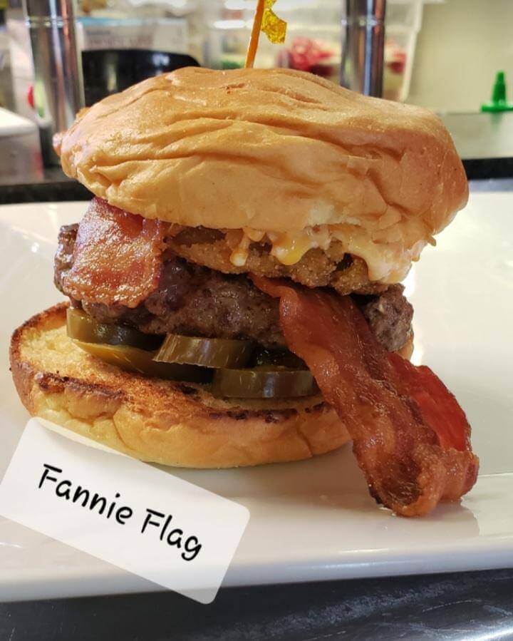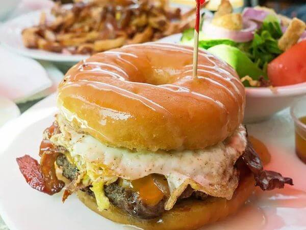 If you’re craving a burger for breakfast, try The Doughnut Burger. The half-pound patty on a freshly glazed doughnut is topped with cheddar cheese, grilled onions, an over easy egg, and bacon.