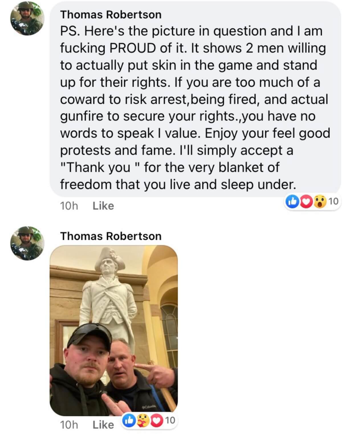 Both Robertson and Fracker posted material on social media after the attack. Fracker has deleted his Facebook account while Robertson made his private. However Dogwood got screenshots of multiple posts before that happened. The two men took a picture of themselves standing in the Capitol Crypt on Jan. 6, in front of the John Stark statue. The crypt is directly beneath the Capitol rotunda. Robertson showed the picture in response to a comment on Fracker’s page. He said he was proud of it.