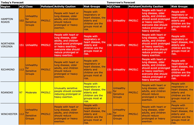 On Thursday, all five Virginia regions mentioned are expected to have either “unhealthy” or “unhealthy for sensitive groups” air quality grades.