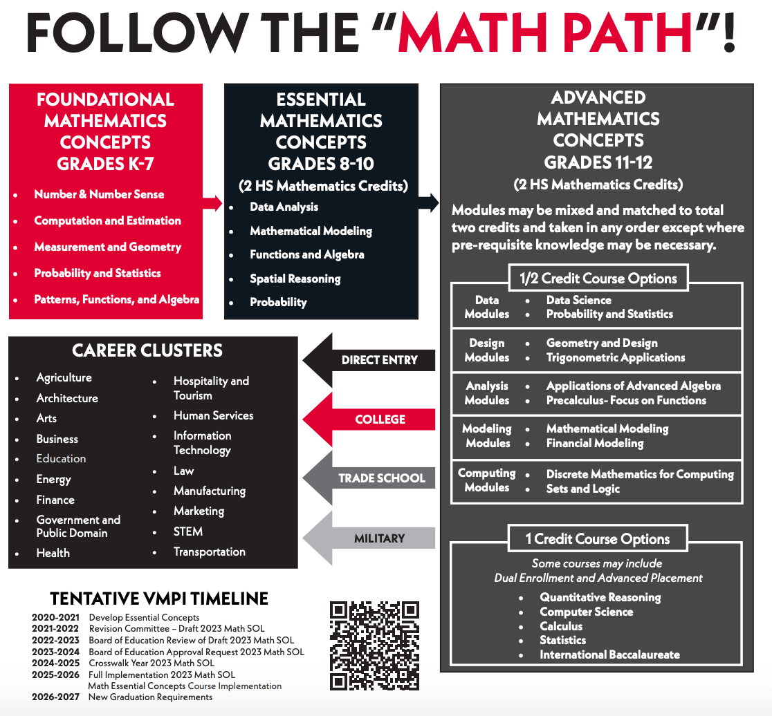 Under the VDOE’s proposed ‘math path,’ students in grades K – 7 will learn foundational mathematics concepts such as numbers, probability, and measurement. Students grades 8-10 will learn essential mathematics concepts including data analysis, algebra, and probability. When they do become available in 11th grade, students in their last two years of high school will have the opportunity to take advanced mathematics classes like trigonometry and computer science.