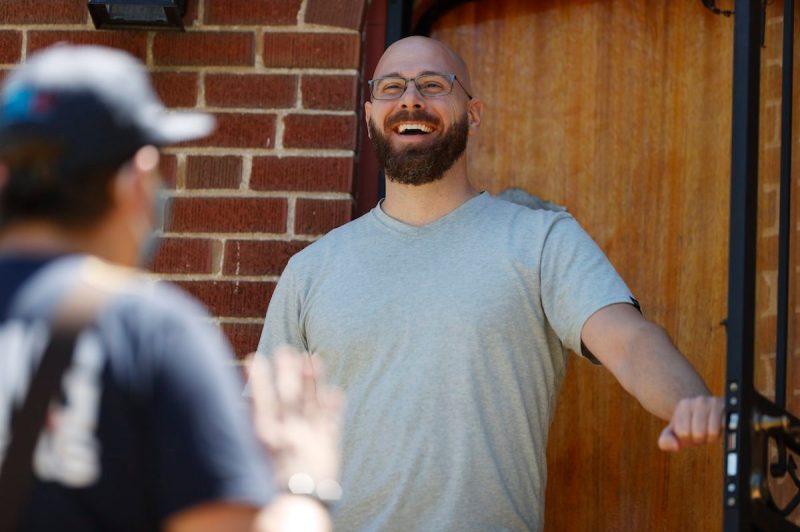 In this Wednesday, June 24, 2020, photograph, Joey Prestley, a staff canvasser for the Progressive Turnout Project, front, talks with Scott Gifford while reaching out to voters in the age of the new coronavirus in northwest Denver. (AP Photo/David Zalubowski)