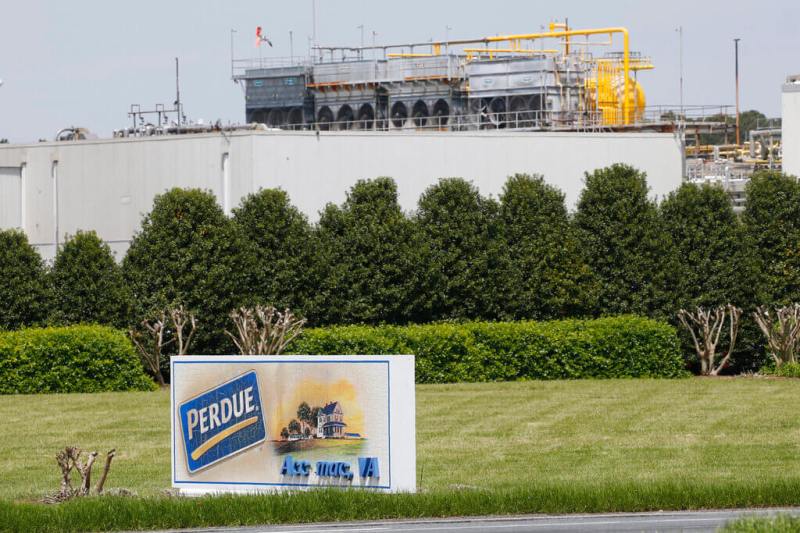 Local hospital officials have reported a spike in COVID-19 cases at the Perdue poultry processing plant on the Eastern Shore Wednesday April 29, 2020, in Accomac, Va. Coronavirus cases among workers at poultry plants on Virginia's Eastern Shore have become an increasing concern for local health officials. (AP Photo/Steve Helber)