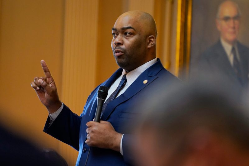 Virginia Del. Lamont Bagby, D-Richmond, gestures during a speech about black History Month during the House session at the Capitol Tuesday Feb. 1, 2022, in Richmond, Va. (AP Photo/Steve Helber)