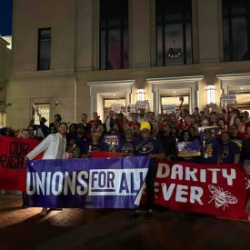 In a massive display of solidarity, a large crowd of home care workers, campus workers, teachers, electricians, and grocery store workers rallied in downtown Richmond on Wednesday evening in support of expanding collective bargaining rights.