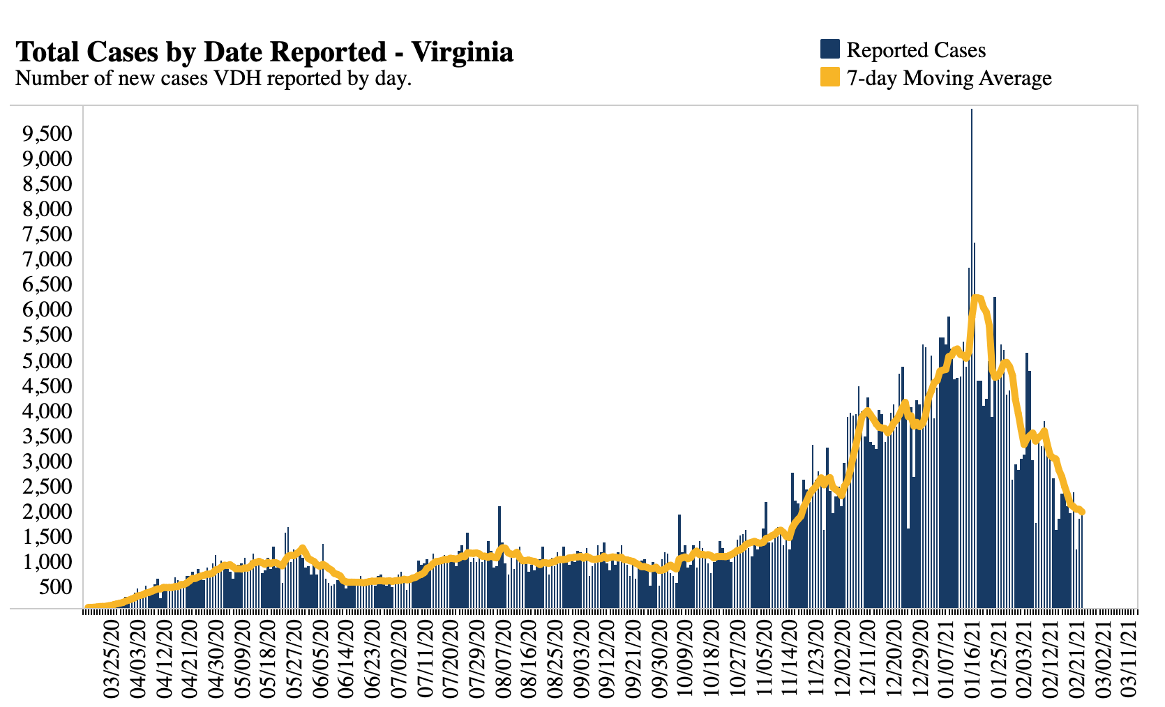 The day of Northam’s announcement, the Virginia Department of Health reports 1,907 cases of the virus in the Commonwealth. Cases of the virus spiked on January 17, when 9,914 Virginians were reported to have the virus in a single day. According to Northam, the reason for that spike is that people were traveling or congregating in large numbers over the holidays.