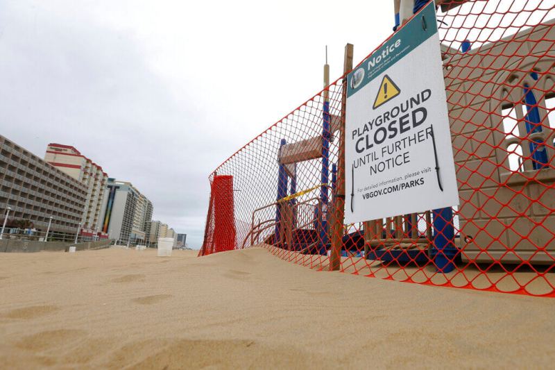 Beachside playgrounds are closed on the oceanfront Saturday April 4, 2020, in Virginia Beach, Va. Activity on the states beaches last weekend prompted Virginia Gov. Ralph Northam to issue more stringent stay at home guidelines. The new coronavirus causes mild or moderate symptoms for most people, but for some, especially older adults and people with existing health problems, it can cause more severe illness or death. (AP Photo/Steve Helber)
