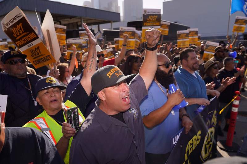 UPS teamsters and workers hold a rally in downtown Los Angeles, as a national strike deadline nears on Wednesday, July 19, 2023. A little more than a week after contract talks between United Parcel Service and the union representing 340,000 of its workers broke down, UPS said it will begin training nonunion employees in the U.S. to step in should there be a strike, which the union has vowed to do if no agreement is reached by the end of this month. (AP Photo/Damian Dovarganes)