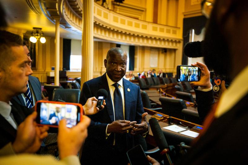 House Minority Leader Del. Don Scott Jr., D-Portsmouth, comments on the legislative agenda for 2023 session at the State Capitol Building in Richmond, Va. on Wednesday Jan. 11, 2023. (AP Photo/John C. Clark)