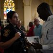 TOPSHOT – A commuity members silhouette is seen through a Pride flag while paying their respects to the victims of the mass shooting at Club Q, an LGBTQ nightclub, in Colorado Springs, Colorado, on November 20, 2022. – At least five people were killed and 18 wounded in a mass shooting at an LGBTQ nightclub in the US city of Colorado Springs, police said on November 20, 2022. (Photo by Jason Connolly / AFP) (Photo by JASON CONNOLLY/AFP via Getty Images)