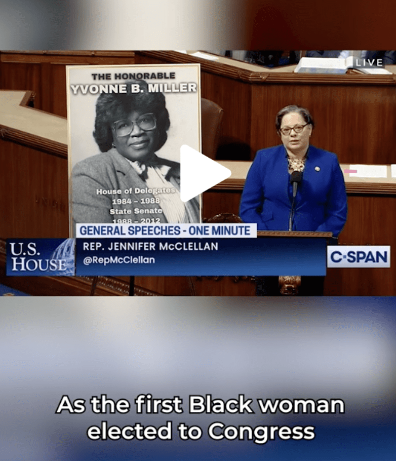 Rep. Jennifer McClellan took the House floor to honor the legacy of Yvonne B. Miller, the first Black woman elected to the General Assembly. “I stand on her shoulders and was proud to pay tribute to her on the House floor,” Congresswoman Jennifer McClellan mentioned on X, formally known as Twitter.