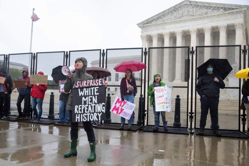 Abortion-rights protester Trish Manzke speaks into a bullhorn during a protest outside of the U.S. Supreme Court, Saturday, May 7, 2022, in Washington. A draft opinion suggests the U.S. Supreme Court could be poised to overturn the landmark 1973 Roe v. Wade case that legalized abortion nationwide, according to a Politico report released Monday. Whatever the outcome, the Politico report represents an extremely rare breach of the court's secretive deliberation process, and on a case of surpassing importance. (AP Photo/Amanda Andrade-Rhoades)