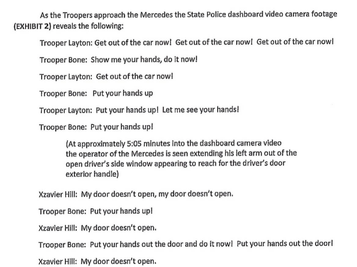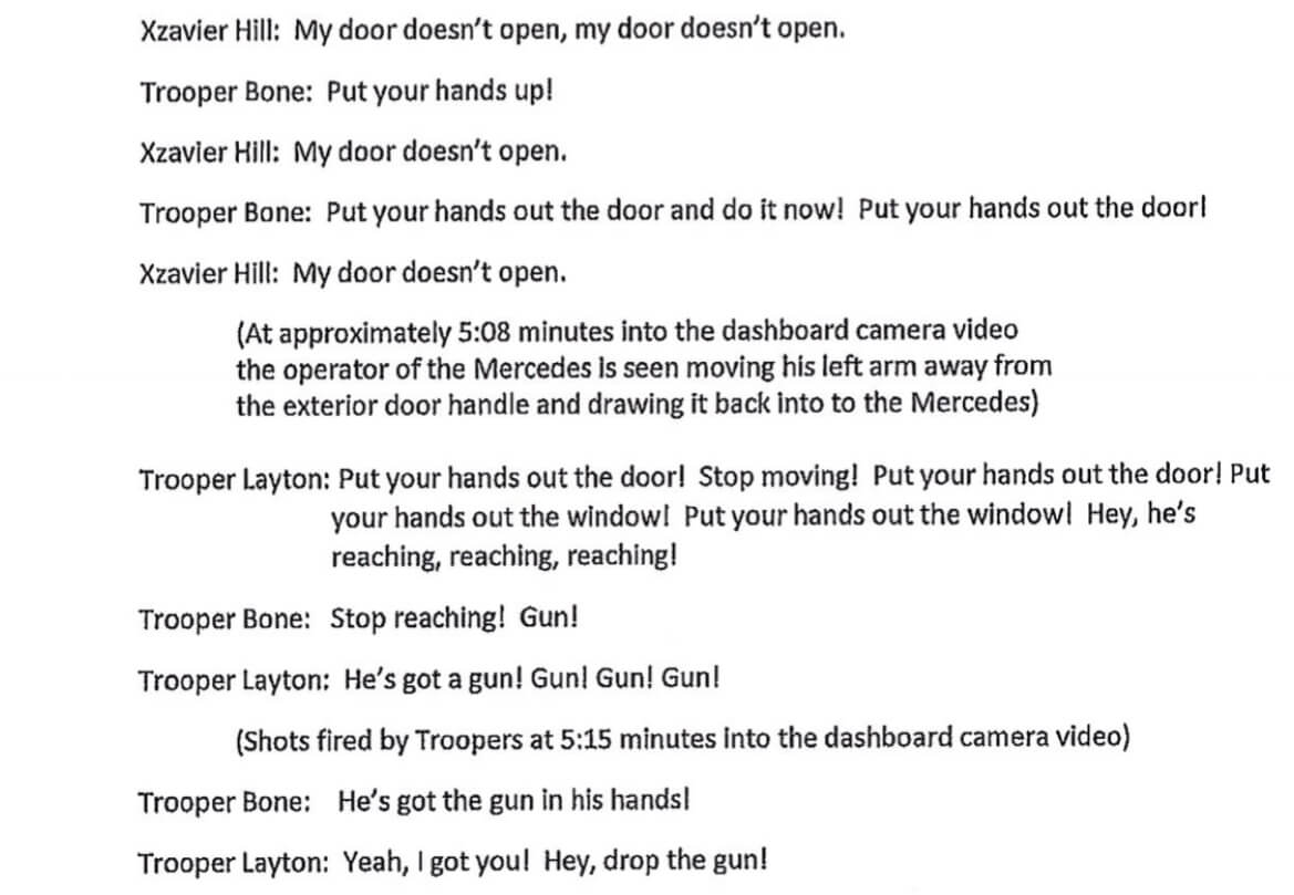 “Xzavier Deyonte Hill initiated and continued to engage in an escalating course of dangerous conduct, resulting in a violent confrontation with law enforcement,” the grant jury’s statement read. “Mr. Hill’s failure to comply with the commands of the Troopers and then introduce a firearm into a rapidly evolving event provided a reasonable basis for the officers to believe they were in imminent danger.”