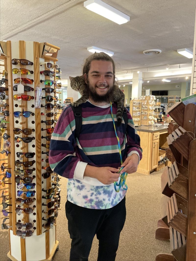 Equipped with a harness and leash for safety, Taupe prefers a unique mode of trans-purr-tation—perched atop Tyler’s shoulders. We met the traveling duo on a recent trip to Natural Bridge State Park, where Tyler regaled us with exciting stories of their ongoing adventure.