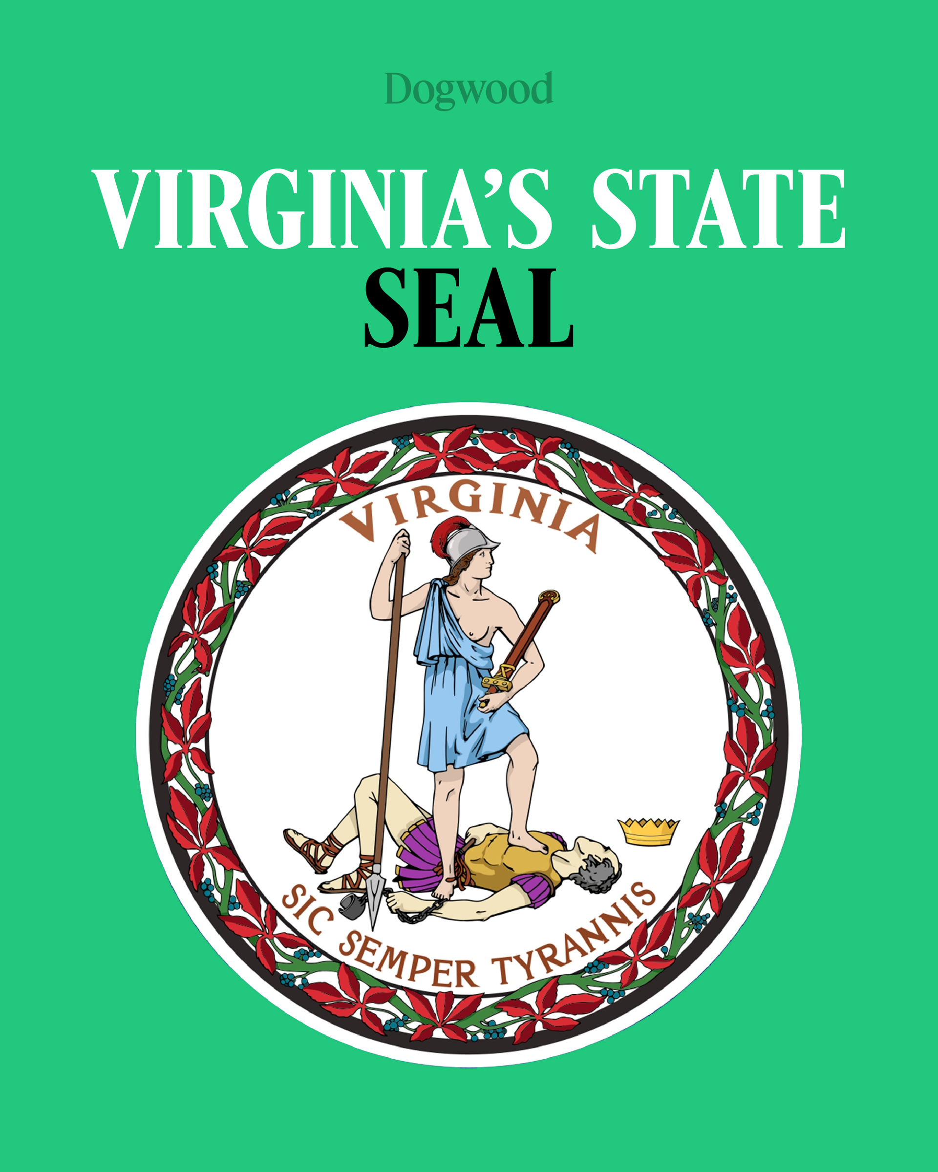 The Virginia State Seal, adopted in 1776, depicts Virtus conquering Tyranny with the phrase “sic semper tyrannis,” meaning “thus always to tyrants!”