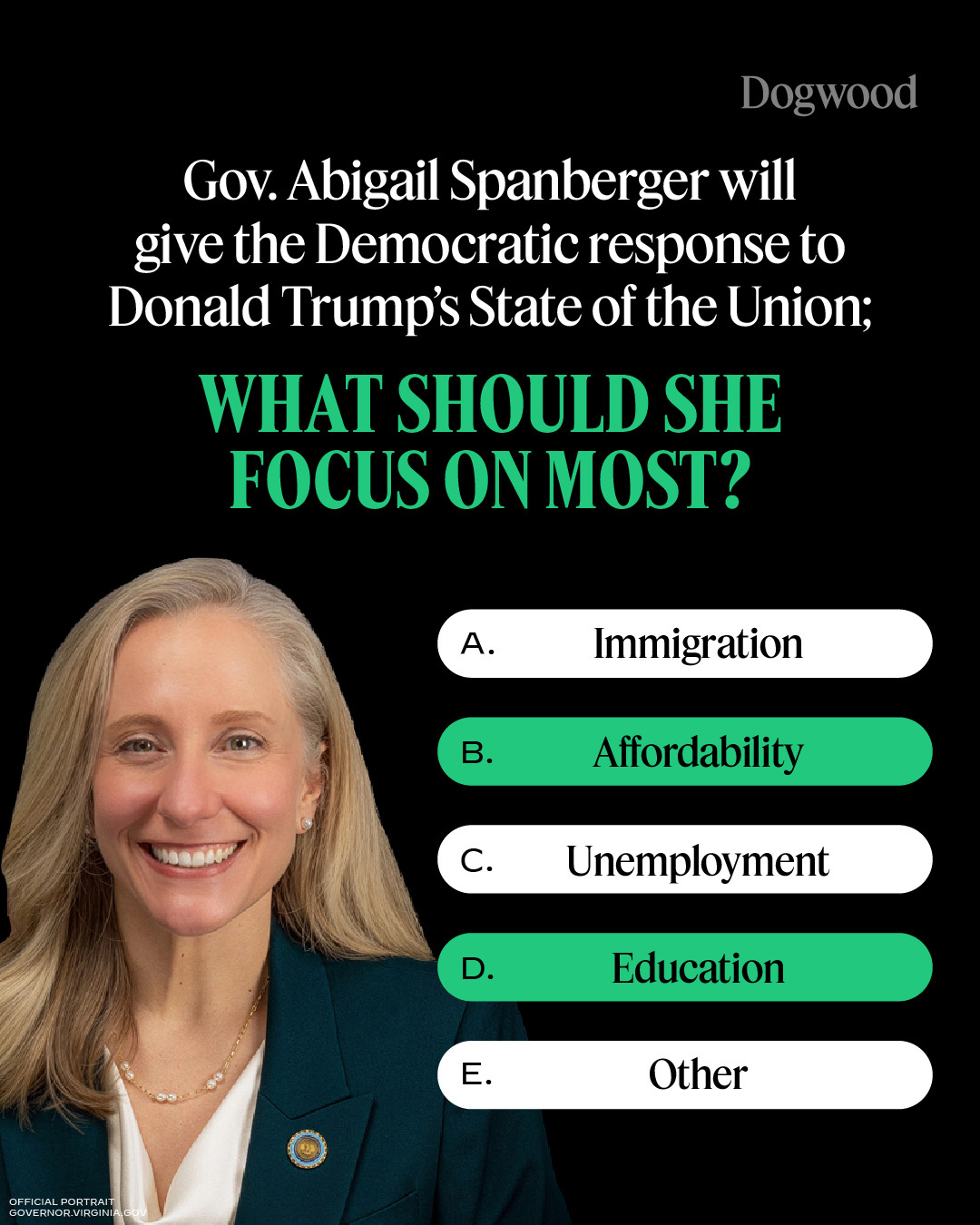 Yes, we just asked for your opinion yesterday—but we really, genuinely want your input here. Tonight (Feb. 24), Virginia Gov. Abigail Spanberger will give her rebuttal to President Donald Trump’s State of the Union address.