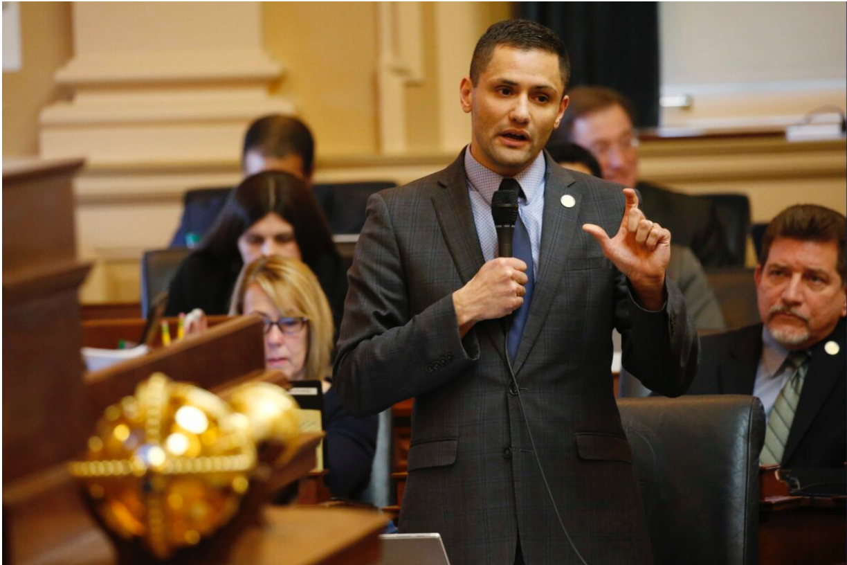 Del. Sam Rasoul, D-Roanoke, gestures during debate on the renewable energy bill on the floor of the House at the Capitol, Thursday, March 5, 2020, in Richmond, Va. (AP Photo/Steve Helber)