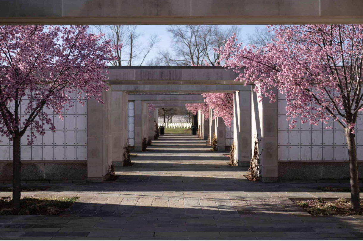 Prunus “Okame” cherry trees bloom in Columbarium Court 9 at Arlington National Cemetery, Arlington, Virginia, March 18, 2025. (Elizabeth Fraser/Arlington National Cemetery)