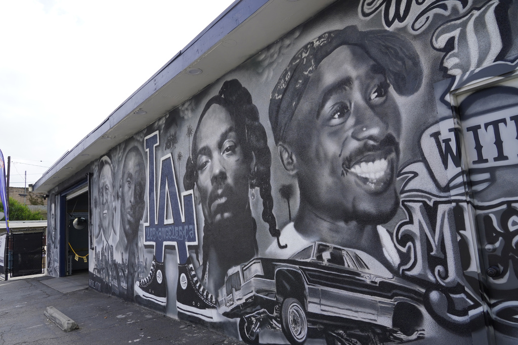 A portion of a mural by artist sloe_motions depicting Oscar De La Hoya, Vin Scully, Kobe Bryant, Snoop Dogg, and Tupac Shakur is seen on the side of Speedy Auto Tint on Friday, Sept. 29, 2023, in Bellflower, Calif. (AP Photo/Chris Pizzello)